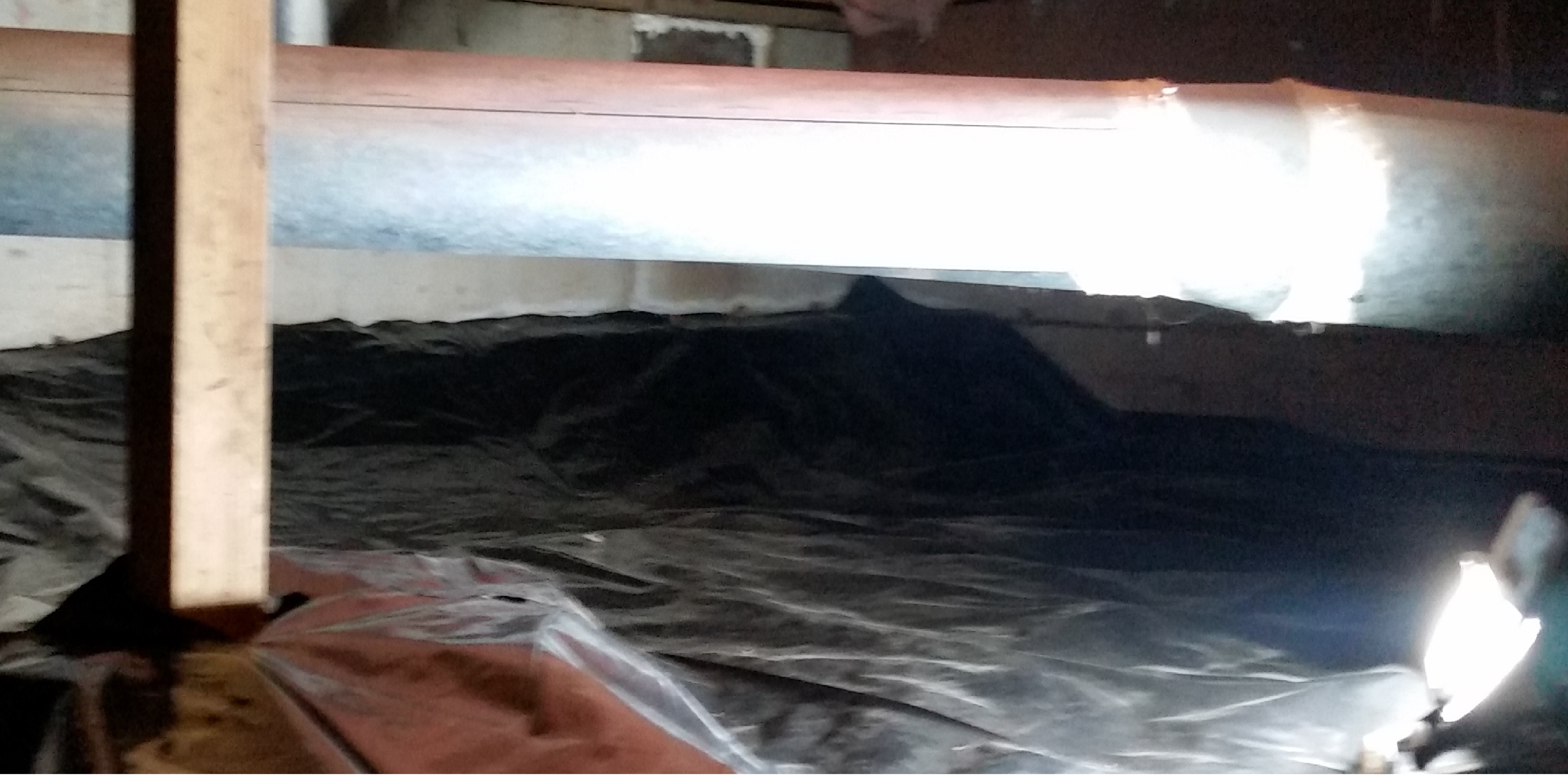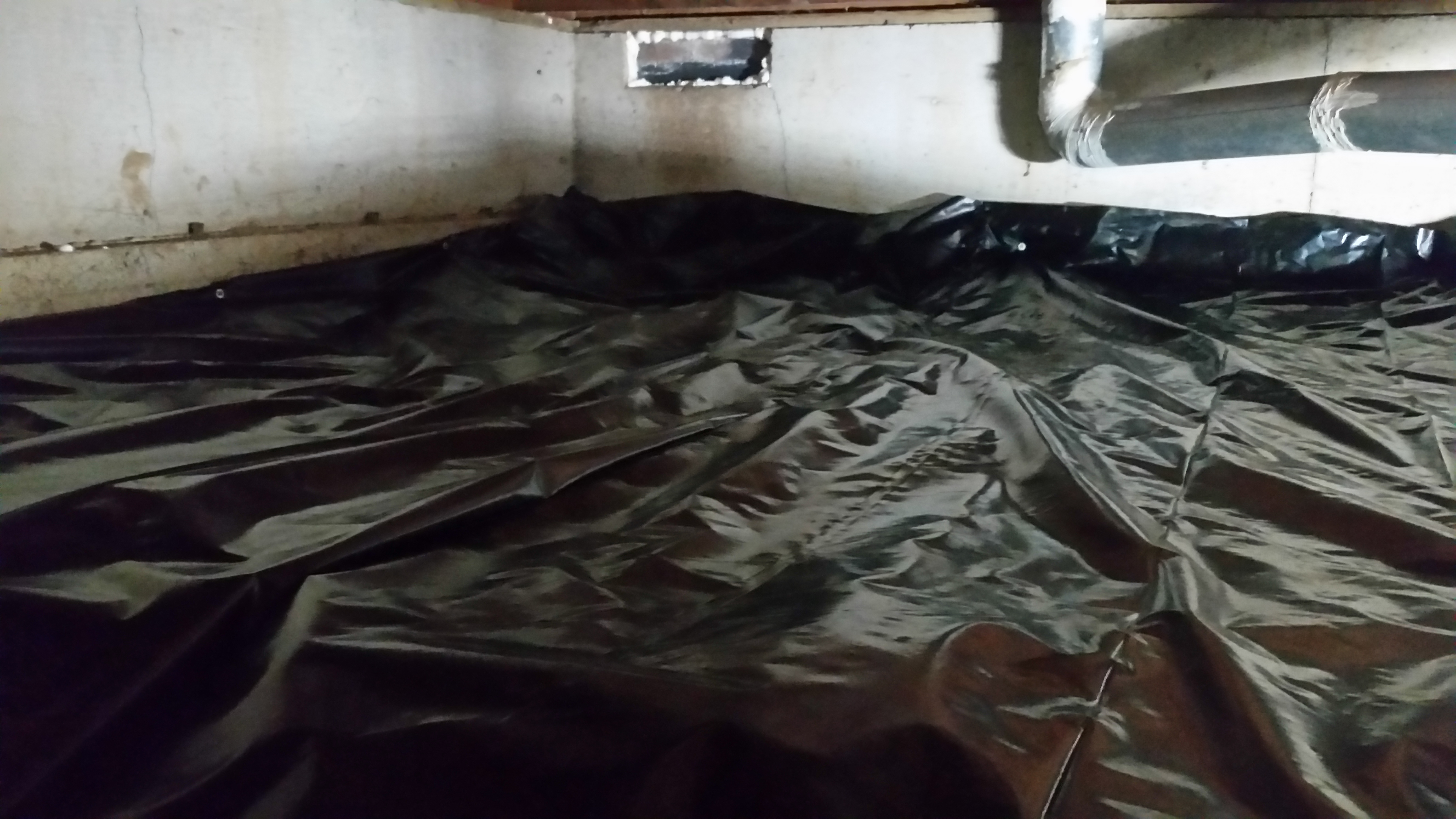 6. The new vapor barrier plastic is installed.  The plastic is 6 mil thick and black to comply with building codes.  The vapor barrier is attached to the edges of the foundation with concrete pins or soil anchors.  Seams are either taped or glued so that the vapor barrier will not become displaced when service people access the crawlspace.